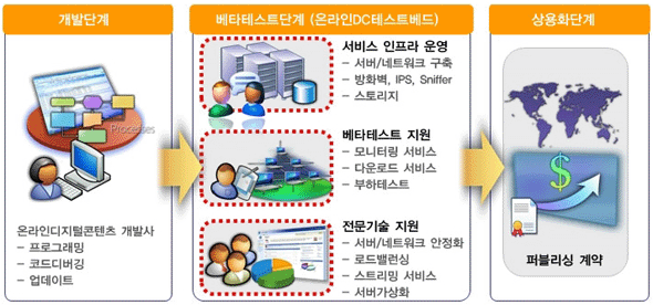 온라인DC테스트베드 지원 사업은 문화체육관광부의 지원 하에 한국전자통신연구원(ETRI) DC기술지원센터와 차세대융합콘텐츠산업협회가 협력하여 온라인디지털콘텐츠를 육성ㆍ지원하는 사업이다. 베타테스트 단계의 온라인디지털콘텐츠(온라인게임, 이러닝, 정보콘텐츠, 제작솔루션 등)를 보유한 국내 개발 기업에게 테스트베드에 필요한 서비스인프라와 콘텐츠서비스 운영 기술을 무상 지원함으로써 개발 콘텐츠의 기간 단축 및 비용 절감 효과를 가져다 줄 것으로 보고 있다.