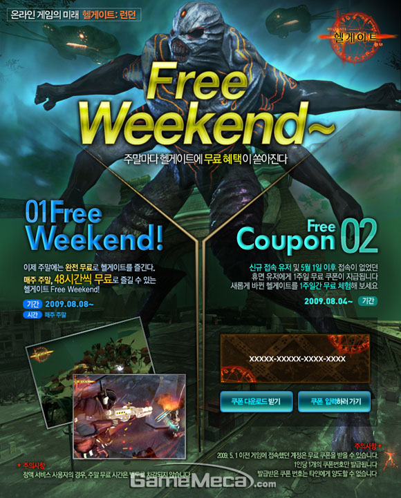 다가오는 토요일인 8일부터는 ‘Free Weekend’ 이벤트를 통해 매주 주말 `헬게이트: 런던`을 무료로 즐길 수 있으며, ‘Free Coupon(프리 쿠폰)’ 이벤트에서는 오늘부터 신규 및 복귀 유저(5월 1일 기준)들에게 `헬게이트: 런던` 1주일 무료 이용 쿠폰’을 지급한다. 공식홈페이지의 이벤트 페이지에서 쿠폰을 발급받아 등록하면 등록 시점부터 일주일간 무료로 게임을 즐길 수 있다.