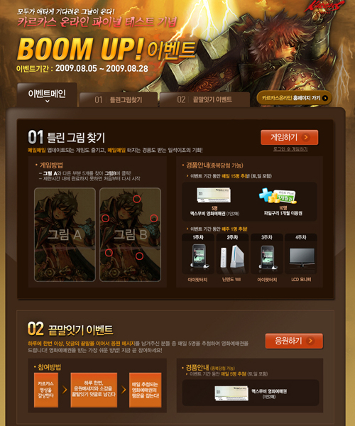 매일 새로운 그림으로 업데이트 되는 ‘틀린그림찾기’는, 카르카스 온라인의 이미지로 만들어진 똑 같은 그림 2개를 보고 양쪽에 틀린 부분을 찾아내면 된다. 제한시간 동안 5개의 틀린 부분을 찾으면, 게임미션을 성공하고 이벤트에 응모하게 된다. 이벤트 기간 동안 매일 추첨을 통해 5명에게는 영화예매권을, 10명에게는 파일구리 이용권을 증정하며, 매일 경품과는 별도로 매주 추첨을 통해 1명을 뽑아 아이팟 터치, 닌텐도 위, LCD모니터를 선물한다.
