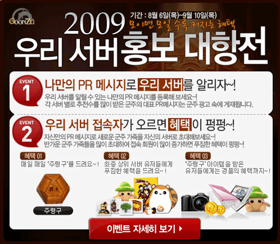 ‘Summer Festival Big 이벤트’, ‘2009 우리 서버 홍보대항전’ 중 하나, ‘나만의 PR메시지로 우리 서버를 알리자!’는 각 서버를 대표하는 제 37대 군주들이 군주의 정치, 경제, 커뮤니티 등의 군주만의 차별화된 게임성을 이용하여 자신의 서버를 홍보할 수 있는 최고의 PR메시지를 등록하는 이벤트로, 각 서버 별로 추천 수를 가장 많이 받은 PR메시지는 각 서버 별 군주의 이름으로 군주 광고 속에 게재된다.