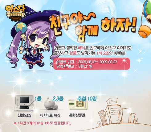 이번 ‘친구야 함께 하자’ 이벤트는 귀여운 배너로 친구에게 ‘아스다이야기’를 홍보하고 선물도 받는 1석 2조 이벤트이다. 이벤트 참여 방법은 재미있는 배너를 보면 마음에 드는 배너를 클릭하고 그 배너를 자신의 블로그나 미니홈피, 카페 등에 올린다. 친구들이 배너를 클릭할 때 마다 1포인트씩 쌓이게 되어 그 포인트가 가장 많은 사람이 홈페이지 랭킹을 통해 순위가 결정된다.
