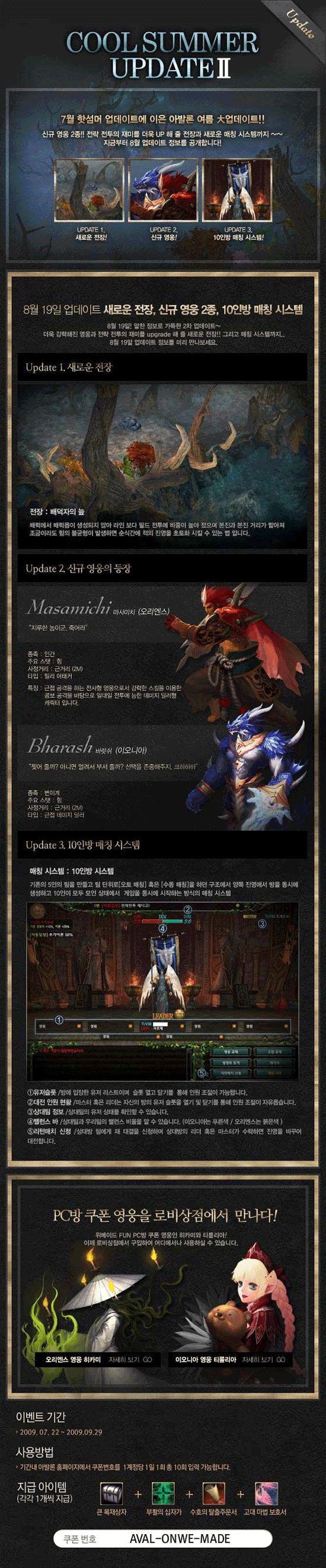 이번 대규모 업데이트에서는 ▲전략전투모드 신규 맵 ‘배덕자의 늪’과 ▲총 2종의 PC방 한정 영웅 ‘마사미치’, ‘바랏쉬’가 추가되며, ▲PC방 쿠폰 영웅 ‘히카미’와 ‘티롤리아’를 로비상점에서 구입 가능케 했다.