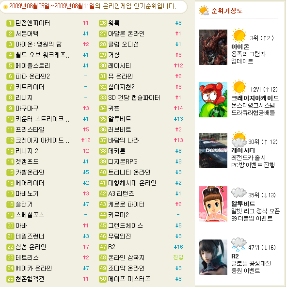여름방학 시즌이 절정을 지나면서 중, 상위권에는 스포츠, 캐주얼게임들의 강세가 눈에 띄고 있다. ‘피파온라인 2’가 변동 없는 6위를, ‘에어라이더’의 등장 이후 오히려 더 기운을 얻은 ‘카트라이더’가 7위를 기록하고 있다. 길거리 농구게임 ‘프리스타일’도 5계단 상승하며 11위를 차지하며 오랜만에 활기찬 모습을 보였다. 야구 게임 라이벌전에서 지난 주 ‘슬러거’에서 제쳐지는 굴욕을 겪은 ‘마구마구’도 당당히 9위에 복귀했다. 반면, ‘슬러거’는 7계단 떨어진 18위를 차지하며 대조를 이뤘다.