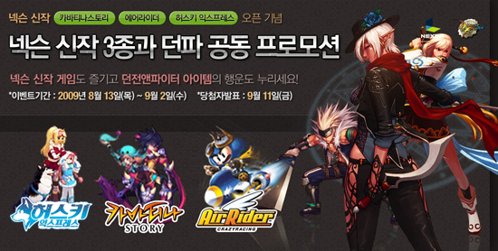 넥슨은 ‘던전앤파이터’의 흥행을 앞세워 여세를 몰아 아예 신작 게임들과 함께 공동 이벤트까지 진행한다. ‘카바티나스토리’, ‘에어라이더’, ‘허스키 익스프레스’에서 레벨을 올리거나 퀘스트를 완료하면 추첨을 통해 던전앤파이터 아이템을 얻을 수 있다. 16위를 차지한 ‘에어라이더’ 외에 두 게임은 50위권 안에 아직 이름도 올리지 못하고 있는 상황. 잘 나가는 형 덕분에 아우들까지 힘을 받을 수 있을 지 결과에 관심이 모아진다.