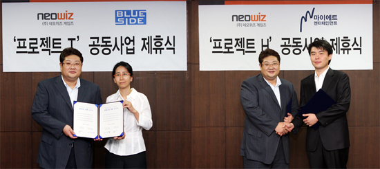 ▲ 네오위즈게임즈는 2011년 서비스 예정으로 블루사이드에서 개발하는 액션 MMORPG `프로젝트 T`와 2010년 하반기 서비스 예정인, 마이에트의 논타겟팅 MMORPG `프로젝트 H`를 퍼블리싱 계약했다.