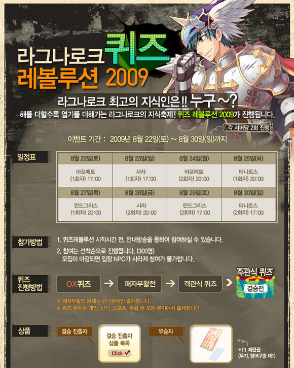 글로벌 온라인게임 기업 그라비티는 `라그나로크 온라인`이 라그나로크 최고 지식인을 뽑는 `도전 2009 퀴즈 레볼루션` 이벤트를 실시한다고 밝혔다.