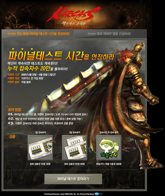 ‘카르카스 온라인’은 29일 파이널 테스트를 개시하면서 총 누적 접속자 수 20만명을 돌파하면 파이널 테스트 시간을 연장하는 이벤트를 진행했다. 지난 1,2차 테스트를 통해 7만 3천명이 게임을 플레이 했으며, 이번 파이널 테스트 시작인 29일 오후 1시부터 30일 저녁 10시까지 13만여명이 접속을 해 총 누적 접속자 수 20만명을 돌파해 홈페이지에 공지를 올리고 테스트 기간을 하루 연장하게 되었다.