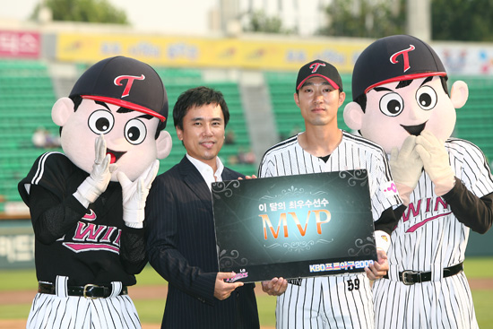 이번 8월 ‘이달의 MVP선수’ 에는 LG트윈스의 분위기 메이커 정성훈 선수가 선정되었다. 정성훈 선수는 ‘4차원 사나이’로 엉뚱하면서도 재치 있는 경기 진행으로 유명하다. 8월 한 달간 21경기에 출전해 3할5푼7리의 타율로 17타점을 올리면 팀 타선의 중심에서 좋은 활약을 보여줬다.