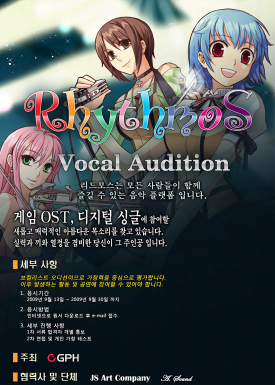 이번 보컬리스트 오디션은 리듬액션게임 ‘리드모스’에 들어갈 음악을 위해 그룹 부활 ‘사랑할수록’ 보컬리스트와 인기 뮤지컬 ‘지저스 크라이스트 슈퍼스타’ 주인공 김재희 씨가 대표로 있는 엔터테인먼트 기획사 ‘JS Art Company’에서 진행한다.