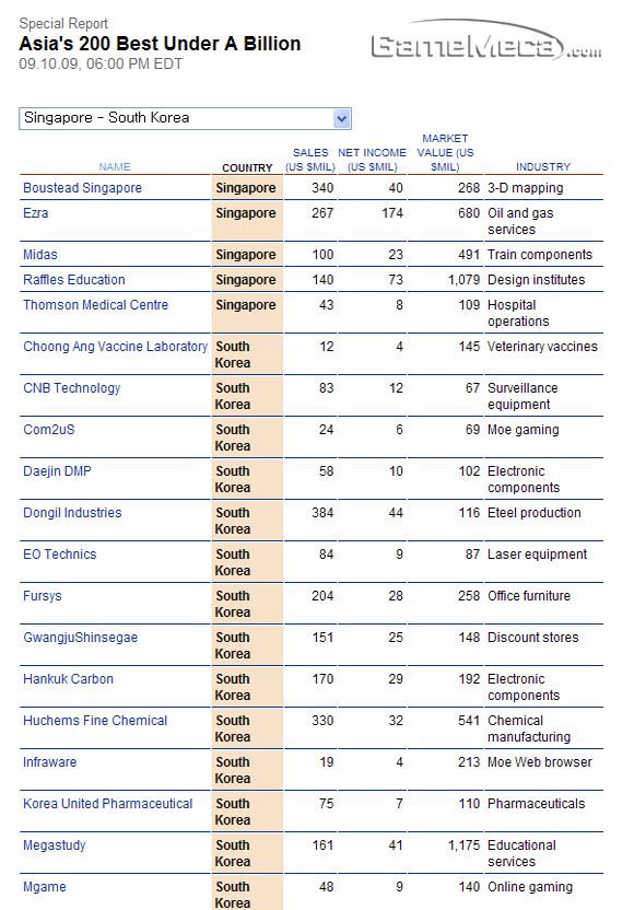 포브스에서는 매년 아시아 태평양 지역의 연 매출 10억 달러 미만의 기업들 중 수익성, 성장성, 이번 년도의 전망 등을 바탕으로 유망 중소기업을 선정, 발표해왔다. 올해도 아시아 태평양 지역을 대상으로 200개의 중소 기업을 선정하여 9월 10일 포브스 아시판을 통해 발표했다. 이번 발표에는 온라인 게임 기업으로는 엠게임이, 모바일 게임 전문 기업으로는 컴투스가 포함된 총 23개의 국내 기업이 선정되었다. 또 다른 국내 기업으로는 메가스터디, 인프라웨어, 유한양행, 태경산업 등이 있다.