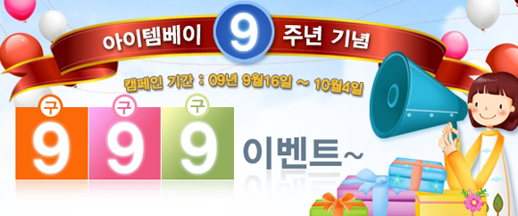 이에 아이템베이는 9주년을 맞아 고객감사 이벤트로 ‘999 이벤트’를 진행한다. ‘2009년 9월, 9주년’에서 중복되는 숫자 ‘9’를 따와서 이름 지은 이 이벤트를 통해 아이템베이는 자사의 고객 999명에게 닌텐도 Wii, 문화상품권, 아이템베이 마일리지 등 다양한 경품을 제공한다. 오는 10월 4일까지 진행되는 이 이벤트는 아이템베이 사이트의 이벤트 페이지에 덧글 형식으로 축하메시지를 남기면 자동 응모되며, 당첨자 발표는 10월 5일로 예정되어 있고, 경품으로는 닌텐도 Wii(9명), 아이템베이 마일리지 9,000점(90명) 문화상품권(900명) 등이 준비되어 있다.