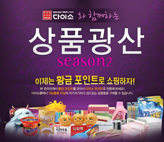 이번 이벤트를 통해 ‘RF온라인’ 유저들은 게임을 통해 얻은 황금포인트로 ‘다이소몰’에서 다루고 있는 수천개의 모든 상품을 구매하여 다가오는 한가위 상품을 유용하게 사용하도록 무료로 제공 할 예정이다. ‘다이소몰’에서 상품을 구매하기 위해서는 우선 사이트에 가입해 황금포인트를 ‘다이소몰’ 포인트로 전환해야 한다.