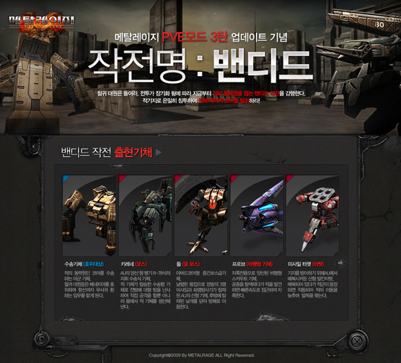 게임하이가 개발하고 CJ인터넷의 게임포털 ‘넷마블’이 공동으로 서비스하는 메카닉 슈팅 액션 ‘메탈레이지’는 23일 PVE 3차 ‘밴디드(Banded)’의 업데이트를 실시한다고 밝혔다.