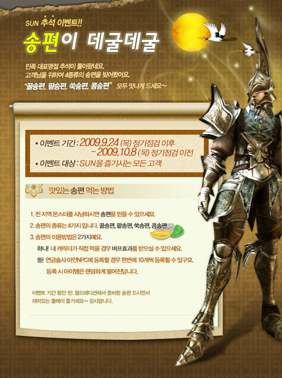 ‘썬: 월드에디션’ 역시 이벤트 아이템 ‘송편’을 통해 추가 버프 효과와 랜덤 아이템을 제공한다. 사냥을 통해 획득한 ‘송편’을 게임 내 NPC에게 등록 시키면 무작위로 선택되는 게임 내 아이템을 받을 수 있다.