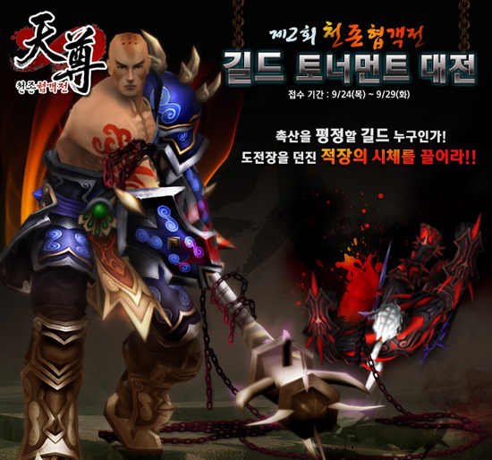 이번 ‘천존협객전’의 길드 대전에 참가를 희망하는 길드는 오는 9월 29일까지 홈페이지(http://tz.space.co.kr)의 이벤트 페이지를 통해 신청할 수 있다. 참가신청이 종료된 후 9월 30일 각 서버별로 총 8개 팀을 추첨해 대진표가 발표될 예정이다.