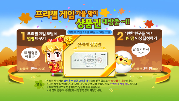 우선, 이벤트 기간 내에 프리챌 게임 포털 내 개인 정보 중 ‘별명’을 변경하면, 추첨을 통해 총 20명에게 1만원권 상품권을 지급한다. 별명을 변경한 고객을 대상으로 하기 때문에 중복 응모도 가능하며, 독특한 별명으로 변경할 경우에는 당첨 확률도 높다.