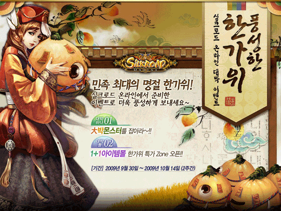 풍성한 한가위를 맞아 실시하는 ‘大박 이벤트’는 실크로드 전 지역에 출현하는 ‘박’ 몬스터를 사냥하는 것으로, 사냥하여 얻는 송편을 이벤트 NPC인 소옥에게 가져가면 스킬경험치20% 증가 주문서, 환재생물약, 그리고 판도라의 상자 등과 교환이 가능하다.