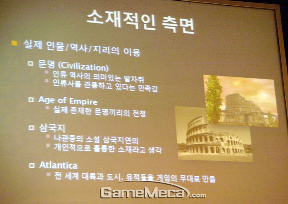 김태곤 이사는 자신이 이미 ‘아틀란티카’를 통해 응용했던 방법론을 소개했다. 이미 사람들에게 익숙한 것들을 게임에 응용하여 차별화하는 방식으로, 실제 존재했던 인물, 역사, 지리를 소재로 이용하고, 방식적인 측면에서 턴제 MMORPG를 제작하는 방법을 소개했다. 김 이사는 이 과정에서 얻을 수 있는 장점과 단점을 모두 설명했다.