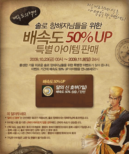 10월 23일부터 11월 8일까지 한정 판매되는 ‘달의 신 호부’는 7일간 배속도를 50% 증가시켜주는 기간한정 특별 아이템이다. 단선에만 효과가 적용되기 때문에 쌀쌀해진 날씨에 더욱 외로워진 솔로 항해자들에게 위로가 될 만하다. 선박 속도 상승 효과를 갖는 기존 아이템인 ‘풍령의 호부’나 ‘풍령의 아뮬렛’, ‘풍령의 보석`과 중복 사용하는 경우, 홀로 항해 중에만 ‘달의 신 호부’ 효과가 적용된다.