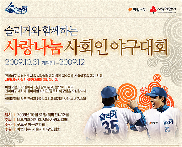 ‘슬러거’와 함께하는 ‘사랑 나눔 사회인 야구대회’는 <네오위즈게임즈>와 <서울 사랑의 열매>가 주최하고, <마법나무>와 <서울시 야구연합회>가 후원하며, <구로구 야구연합회>가 주관하는 저소득층 아동 돕기 자선 대회이다.