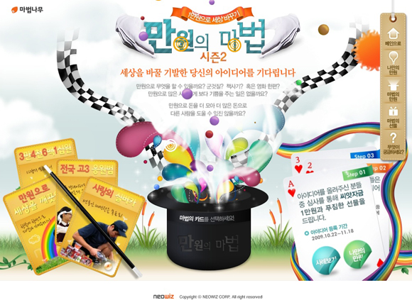 ‘만원의 마법’에 대한 취지나 신청 방법, 샘플 사례, 문의 등 자세한 사항은 ‘만원의 마법’ 홈페이지(10000won.neowiz.com)에서 확인할 수 있다.