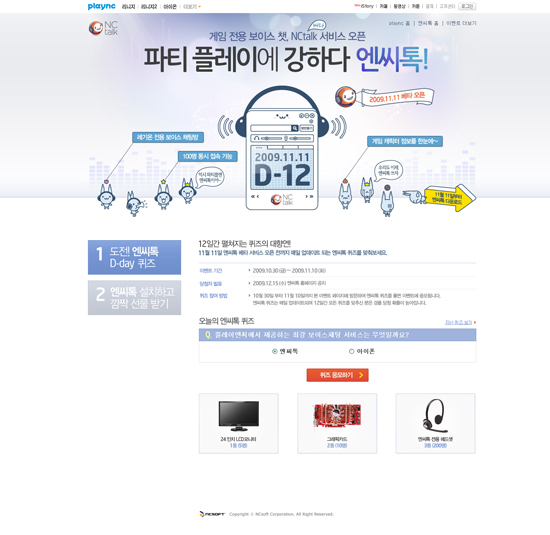 또한, 11월 11일부터 12월 3일까지 ‘엔씨톡 설치하고 깜짝 선물 받기’ 이벤트가 진행된다. 이벤트 기간 중 엔씨톡을 설치하여 로그인하면 접속자들 중 랜덤으로 아이온 에디션 LG 노트북, 데스크탑 PC, LCD 모니터 등 깜짝 선물을 제공한다.