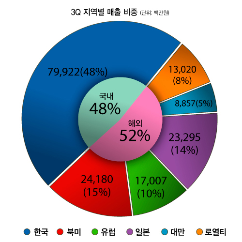 일본/대만/북미/유럽 지역에서 `아이온` 상용 서비스가 순항함에 따라 해외 매출 비중이 처음으로 국내 매출 비중을 넘어섰다. 지역별 매출은 한국 799억원, 북미 242억원, 유럽 170억원, 일본 233억원, 대만 89억원, 로열티 130억원을 기록했고, 특히, 북미, 유럽, 대만 지역 매출은 전분기 대비 각각 127%, 301%, 121% 증가하면서, 전체 매출에서 해외 매출 비중이 52%를 차지했다.