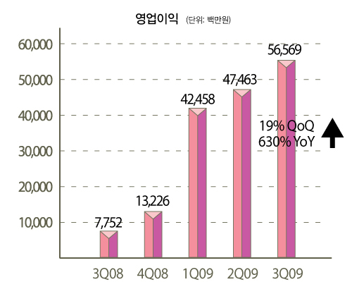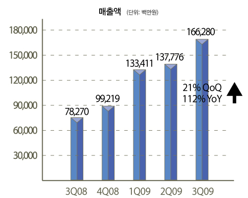 엔씨소프트는 2009년 3분기 결산결과 연결매출 1,663억원, 연결영업이익 566억원, 연결당기순이익 469억원을 기록했다고 밝혔다. 전년동기와 비교해 매출은 112% 늘었으며, 영업이익과 당기순이익은 각각 630%, 836% 증가한 것으로 전년동기 대비 대폭 개선된 실적을 보여주고 있다.