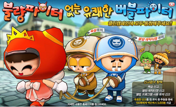 ‘카트라이더’와 ‘버블파이터’에서는 욕설 등의 부적절한 대화, 캐릭터명, 그리고 불법 프로그램을 사용하는 유저를 신고하면 추첨을 통해 ‘모범 라이더 풍선’, 넥슨캐시 등을 제공하는 이벤트가 실시된다. 카트라이더는 25일까지, 버블파이터는 30일까지 진행된다.
