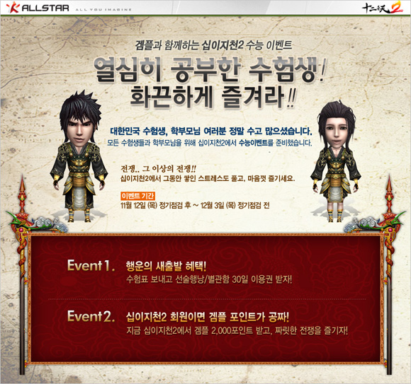 KTH ‘올스타’는 알트원이 개발한 MMORPG `십이지천2`에서 수험생을 위한 ‘수능 이벤트’를 진행한다고 금일(13일)밝혔다. ‘열심히 공부한 수험생! 화끈하게 즐겨라!’를 메인 슬로건으로 내세운 이번 ‘수능 이벤트’는 시험 당일인 이달 12일부터 12월 3일까지 22일간, `십이지천2` 유저와 수험생을 대상으로 진행된다.