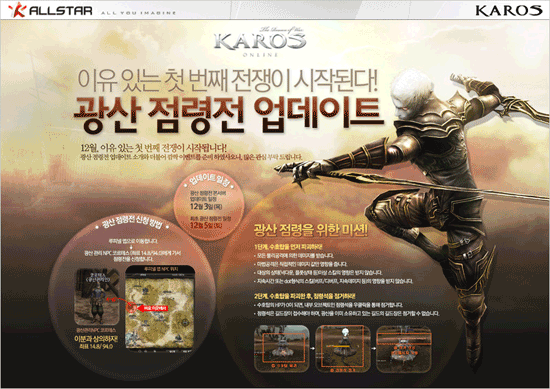 KTH ‘올스타’(www.allstar.co.kr)는 자사가 서비스 중인 `카로스 온라인`이 서비스 오픈 후, 오는 12월 3일 첫 업데이트를 단행할 예정이라고 밝히며 신규 콘텐츠의 내용을 공개했다.