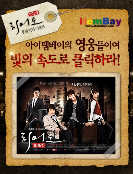 아이템베이는 ‘히어로’ 후원을 기념하고, 자사의 고객들과 함께 ‘히어로’를 응원하기 위해 드라마 방영 시간대에 자사 사이트(www.itembay.com)에서 금액제한 없이 사용할 수 있는 할인쿠폰 10,000원/5,000원/2,000원/1,000원권을 선착순으로 500명에게 제공하는 타임 이벤트를 진행한다. 이 이벤트는 드라마 방영일인 매주 수?목요일 밤 10시에 시작되며, 16부작 드라마가 종영될 때까지 계속된다.