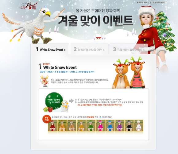 우선 올 겨울 눈이 얼마나 내릴지 모르지만 만약 사랑하는 애인과 흰 눈을 구경하고 싶은데 눈이 오지 않는다면 실망하지 말고 무협대전 쟁을 즐기면 된다. 오는 3일부터 2월 25일까지 이벤트 기간 중 게임 내에 눈이 내리면 운기조식 속도 2배, 몬스터 사냥 시 수련치 +10 추가 획득을 비롯해 눈사람, 루돌프 아이템 착용시 능력치가 상승하는 ‘화이트 스노우 이벤트’가 진행된다. 또한 각 마을에 있는 크리스마스 요정 NPC를 통해 자신이 원하는 산타복장을 구매할 수도 있다.