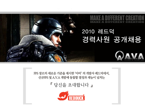 온라인 FPS 게임 ‘아바(A.V.A)’ 개발사로 유명한 레드덕이 경력 사원을 대상으로 한 2010 공개 채용 일정을 밝히고 금일부터 본격적인 모집에 나섰다. 지난 해에 이어 두 번째로 실시되는 레드덕의 공개 채용은 전문 개발사로서는 이례적인 것으로 기업의 꾸준한 성장 일로와 우수한 개발 인력 확보의 강한 의지를 보여주고 있는 것이라 할 수 있다.
