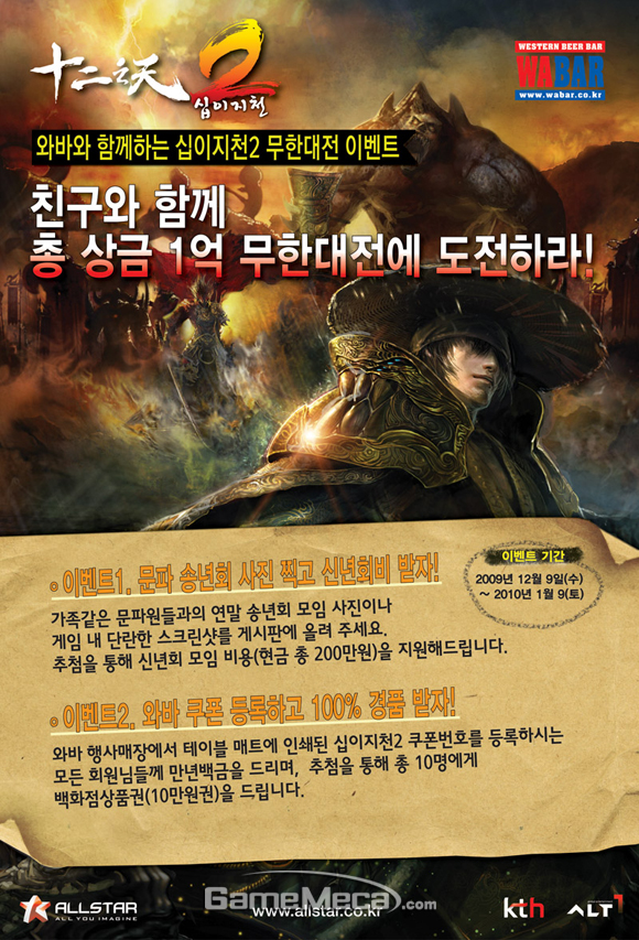 이와 함께 외식산업업체 `와바(WABAR)`와 제휴를 맺고 12월 9일부터 내달 1월 9일까지 공동 프로모션을 개최한다. 전국 ‘와바’ 매장에서 받을 수 있는 ‘십이지천2’ 쿠폰을 공식 웹사이트 이벤트 페이지에 등록한 모든 회원에게 게임 아이템 ‘만년백금’을 100% 증정하며, 추첨을 통해 총 10명에게 백화점상품권을 준다.