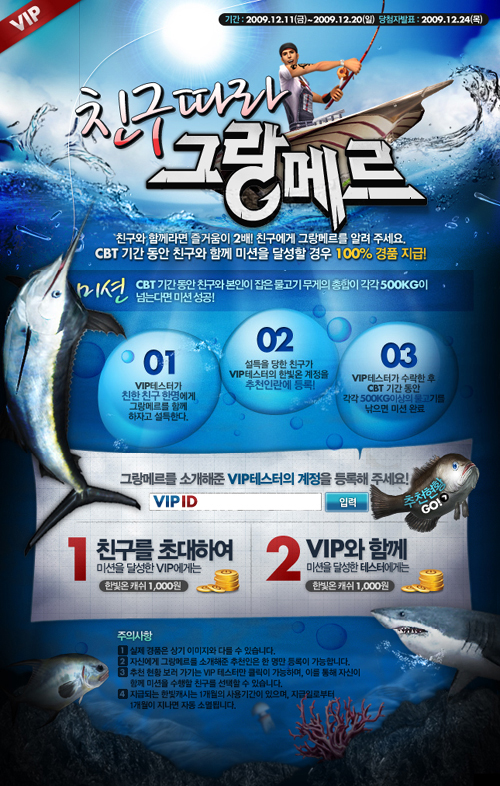 한빛소프트는 오늘(11일) 자사가 서비스하는 온라인 낚시게임 ‘그랑메르(http://gm.hanbiton.com)’가 오늘부터 12월 20일까지 비공개테스터를 모집한다고 밝혔다.