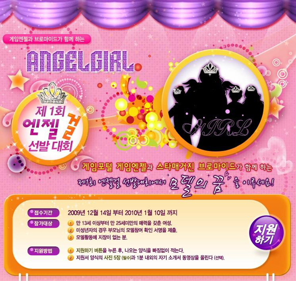 휴먼웍스의 게임포털 게임엔젤(http://gameangel.com)과 스타매거진 브로마이드가 공동 주최로 전국 일반인들을 대상으로 한 ‘제1회 엔젤 걸 선발대회’를 12월 14일 개최한다.