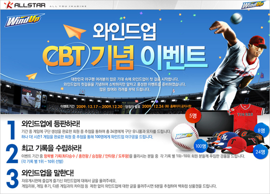 한편, ‘와인드업’은 비공개 테스트 기간 동안 ‘와인드업에 등판하라’, ‘최고 기록을 수립하라!’, ‘와인드업을 말한다’로 구성된 세가지 이벤트를 진행하고, 총 187명에게 프로야구단 유니폼과 모자, 야구공, LCD모니터 등 알찬 경품을 제공한다.