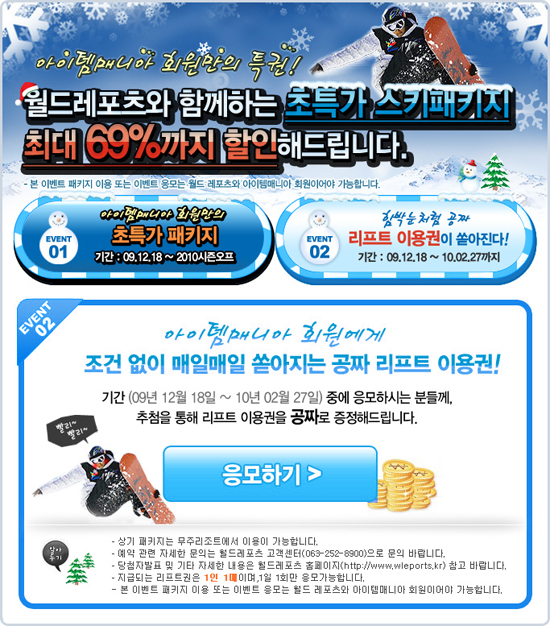 IMI는 자사의 ‘아이템매니아’ 사이트 회원에게 ‘0910시즌 무주리조트 리프트권’을 무료 증정하고, 패키지 할인 혜택을 주는 이벤트를 내년 2월 27일(토)까지 진행한다고 밝혔다.