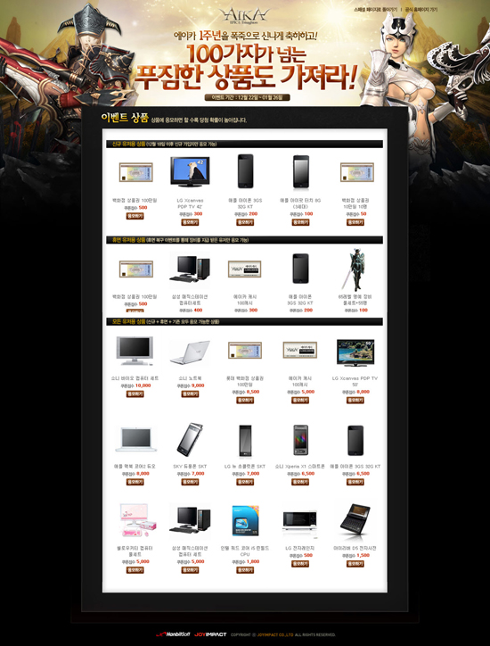획득한 폭죽을 게임 내에서 사용하면 100가지가 넘는 상품에 응모할 수 있는 ‘1주년 포인트’가 누적되며, 이벤트 게시판에서 해당포인트를 확인할 수 있다. 포인트 점수에 따라 ‘컴퓨터 풀세트’, ‘노트북’, ‘백화점 상품권 100만원’, ‘50인치 PDP TV’ 등 다양한 상품에 응모할 수 있다. 더불어 포인트 점수를 많이 획득한 리전과 개인에게 랭킹에 따라 차등을 둔 에이카 프리미엄 캐시를 증정한다.