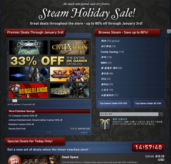‘하프라이프’시리즈의 판매로 유명한 ‘스팀(http://www.steampowered.com)’에서는 지난 22일부터 ‘컴퍼니 오브 히어로즈’, ‘데드 스페이스’등의 게임을 약 10%에서 70%까지 할인된 가격으로 판매하고 있다. 여기에 ‘Special Deals for Today Only!’코너를 통해 매일 약 33시간 정도의 한정된 시간 동안 특정 게임들을 적게는 50%, 많게는 77% 할인판매를 하는 행사를 벌이고 있다. 한편, 게임 웹진 IGN으로 유명한 IGN 엔터테인먼트 그룹의 ‘Direct2Drive(http://www.direct2drive.com)’에서도 ‘스팀’의 할인 공세에 대항하기 위한 맞불 작전으로 ‘레드얼럿3’등의 70여 가지의 게임을 반값에 내놓는 ‘D2D’s Year-End blow out!’ 를 실시하고 있다. 여기에 해외 고전게임 구매 사이트인 ‘GOG.com(http://www.gog.com)’에서도 연말 기념 할인 행사로 10~50%의 할인 행사를 실시하고 있다.