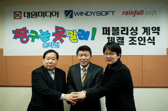 윈디소프트는 대원미디어와 레인폴소프트(www.rainfall.co.kr)가 공동 개발 중인 ‘짱구는 못말려 온라인’의 국내 퍼블리싱 서비스 계약 체결식을 지난 12월 28일 진행했다고 밝혔다.