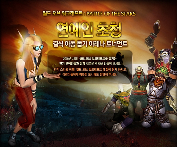 블리자드 엔터테인먼트는 한국에서 월드 오브 워크래프트 배틀 오브 더 스타즈 토너먼트를 개최한다. 이번 이벤트는 국내 결식 아동을 돕기 위해 연예인과 월드 오브 워크래프트 플레이어를 초청하여 아레나 토너먼트 형식으로 진행된다.