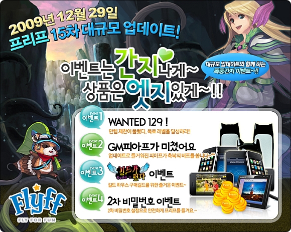 더불어 `프리프`는 대규모 업데이트와 함께 이벤트를 진행한다. 금일 29일부터 실시하는 “이벤트는 간지나게~ 상품은 엣지있게~!!”이벤트는 최고 레벨 게이머를 위한 ‘WANTED 129!’, 운영자(이하 GM)가 직접 게이머들에게 혜택을 선물하는 ‘GM 피아프가 미쳤어요’, 그리고 신규 게이머들에게 아이폰을 선물하는 ‘2차 전직의 기쁨’ 등 6가지의 이벤트가 실시된다.