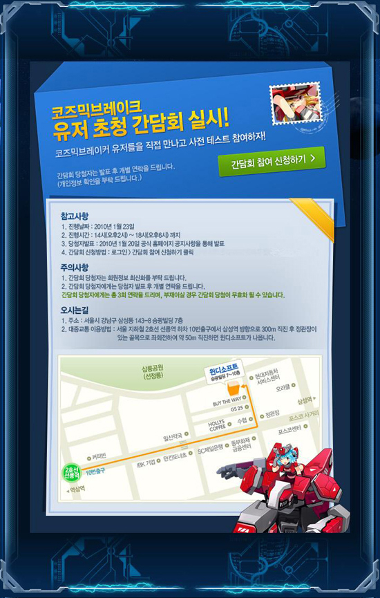 이번 간담회에 참석을 원하는 유저는 ‘코즈믹브레이크’ 공식홈페이지에서 금일부터 신청이 가능하며, 당첨자는 1월 20일 홈페이지 공지 및 개별통보로 발표된다.