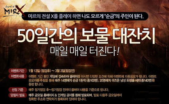 위메이드 엔터테인먼트가 선보이는 또 하나의 전설 `미르의 전설X(www.mirx.co.kr)`가 13일, 신년맞이 ‘50일간의 보물 대잔치’를 실시한다.