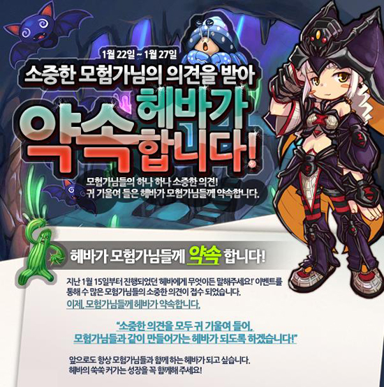 `헤바에게 무엇이든 말해주세요!`는 게임을 즐기면서 다소 불편했던 점들이나 발견한 버그, 밸런스 등 게임 전반에 대한 유저들의 의견을 듣는 프로모션으로, 접수된 의견 중 게임에 즉각 반영되는 내용은 1월 22일 공식 홈페이지를 통해 발표할 예정이다.