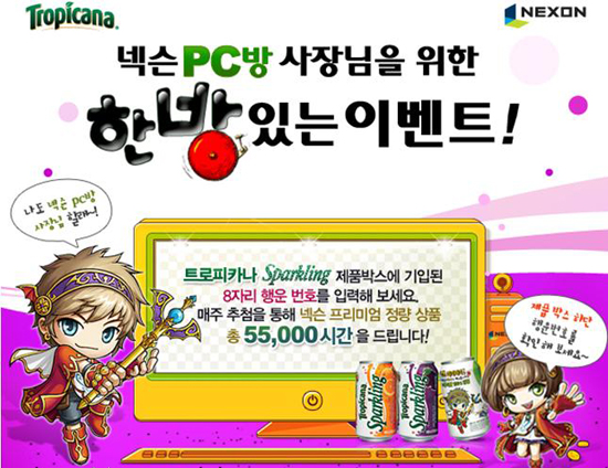 롯데칠성의 신제품 ‘트로피카나 스파클링’ 출시에 맞춰 마련된 이번 행사는 전국 넥슨 가맹 PC방 업주를 대상으로 오는 3월 19일까지 총 10주간 진행된다.