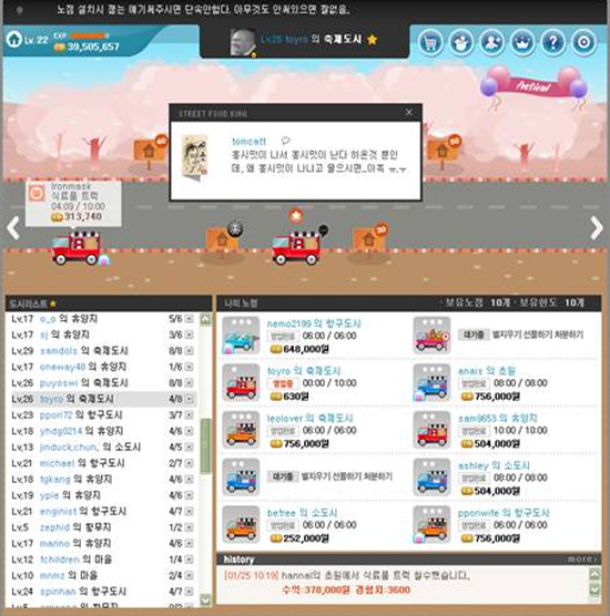 ‘노점왕’은 개방형 소셜 네트워킹 서비스 ‘스푼’(www.sfoon.com)에서 즐기는 웹 기반의 소셜 게임으로, 단속을 당하거나 해당 도시에 경찰이 출동하면 ‘스푼’으로 게임 메시지가 전달된다. 그 동안은 게임 시스템이 전송하는 일반적인 안내 메시지를 받았다면, 앞으로는 내 친구가 노점을 배치하면서 직접 남긴 메시지를 받아볼 수 있게 된다.