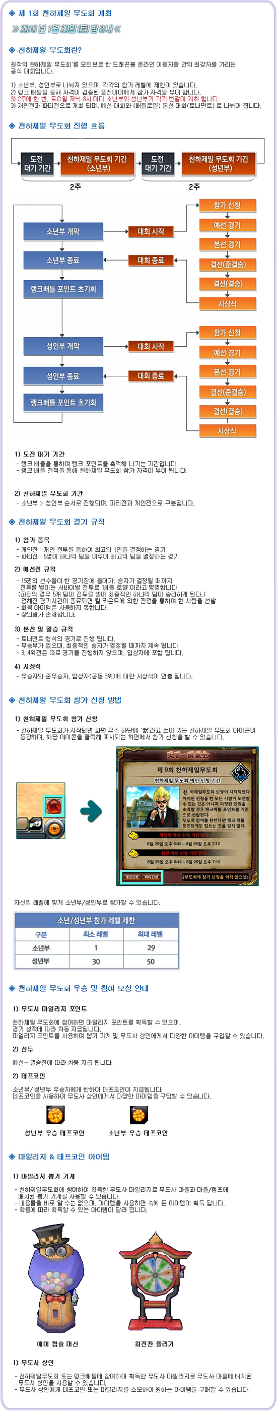 ‘천하제일무도회’는 이 대회를 시작으로 각 부별로 한달 간격으로 실시되며, 개인전과 5명이 팀으로 참가하는 파티전으로 나뉘어 예선 및 본선 대회를 진행하게 된다.